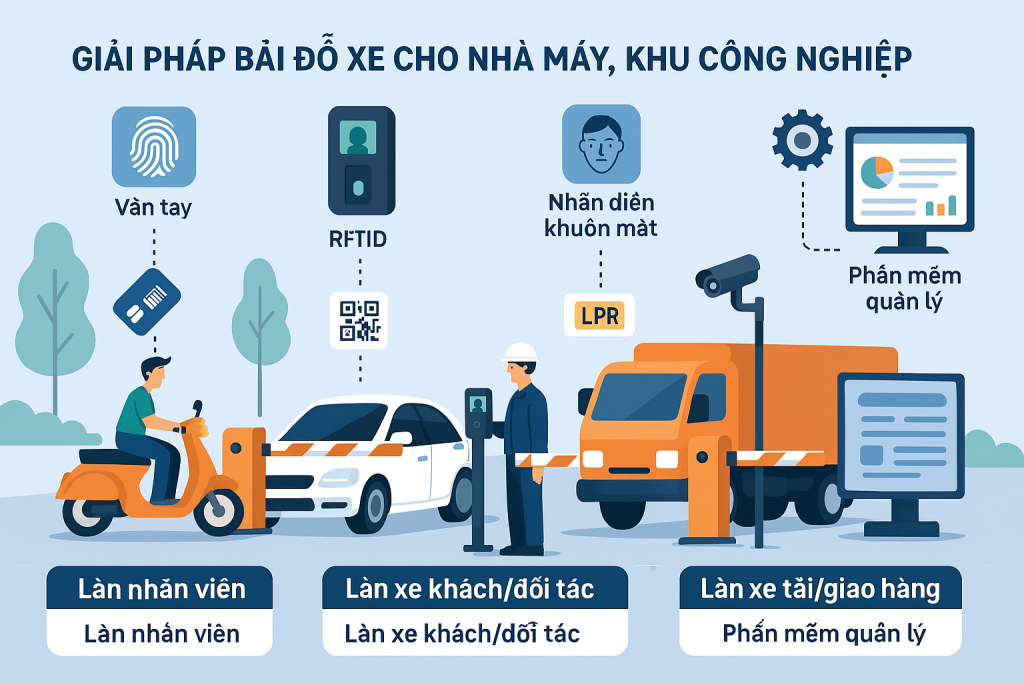Giải pháp bãi đỗ xe cho nhà máy và khu công nghiệp cần đảm bảo các yếu tố: an ninh cao, kiểm soát chính xác, xử lý nhanh chóng, dễ dàng tích hợp, và đáp ứng quy mô lớn. Dưới đây là một giải pháp tổng thể: